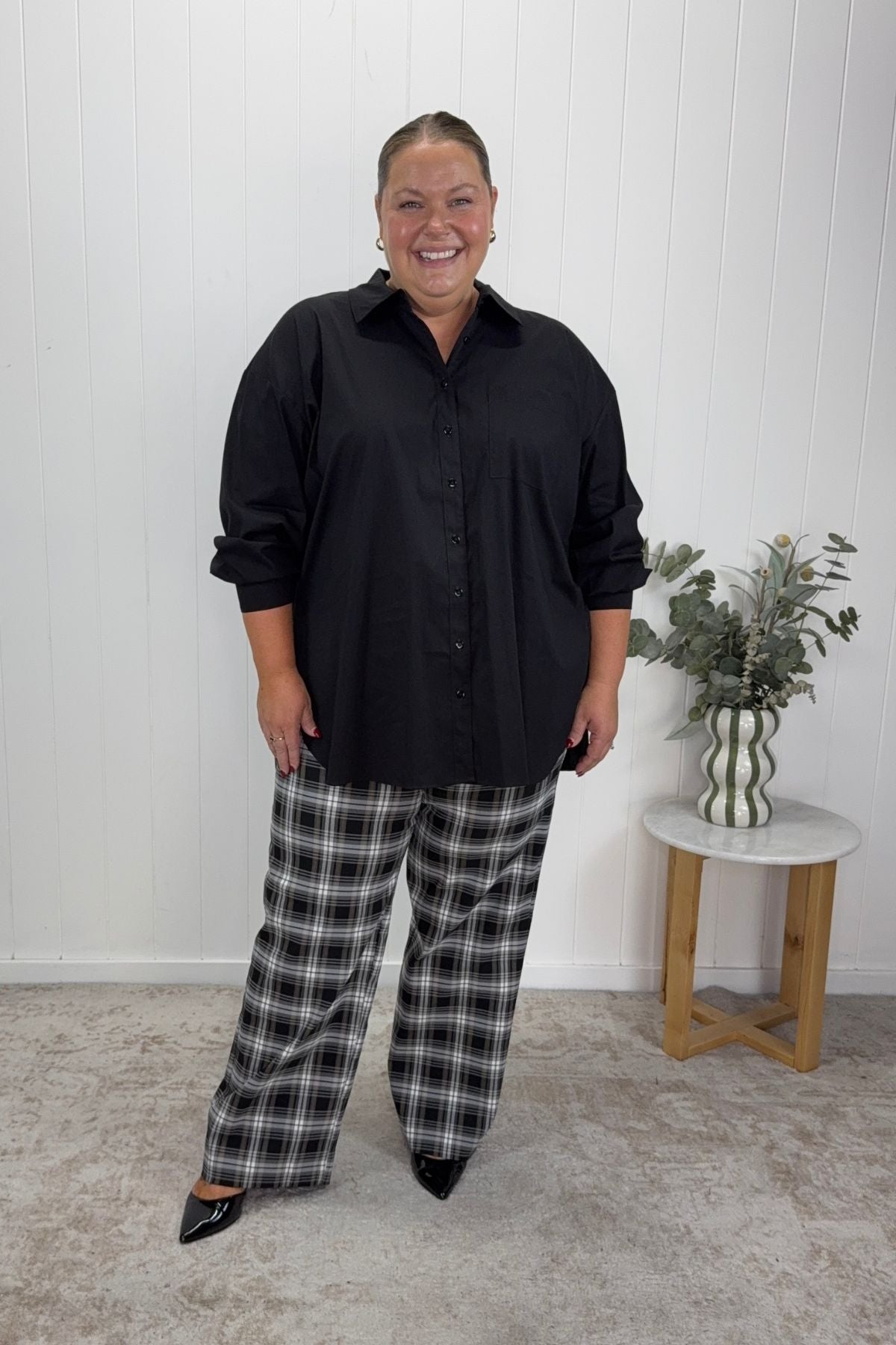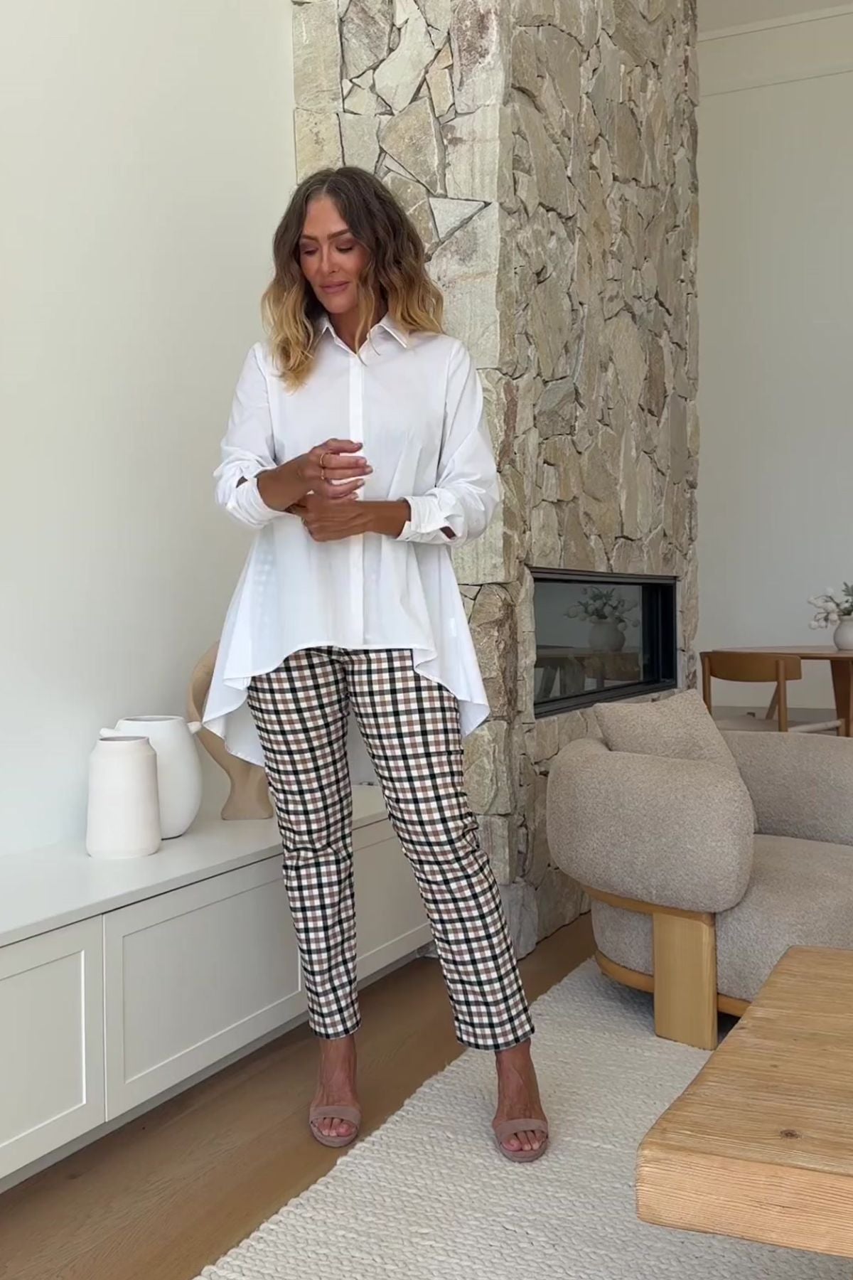 AILSA CITY STRETCH COTTON HI LO SHIRT + PROVO CHECK BENGALINE PANT