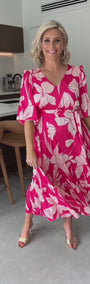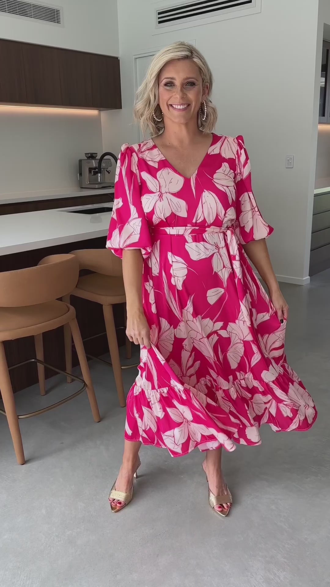 Easy wear -Â Wear her loose and lovely or define your waist with the self fabric tie belt. The billow sleeves have an elasticated cuff so you can customise your look.
