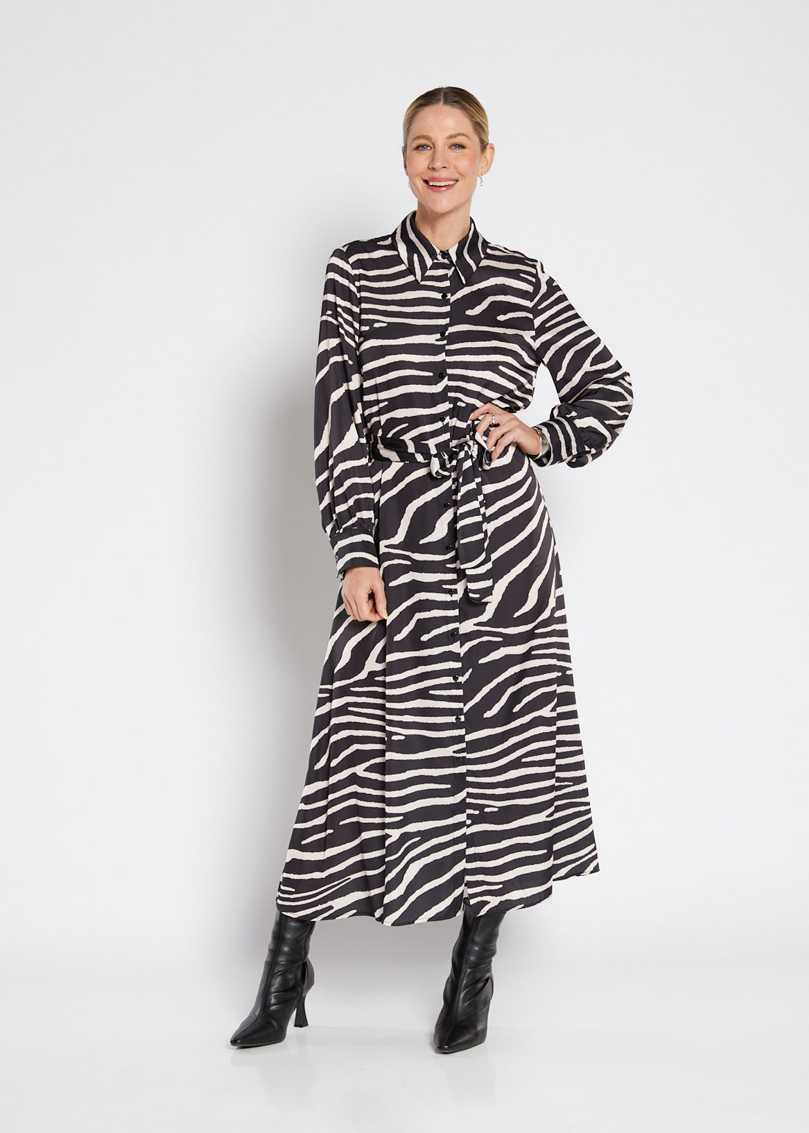 Easy wear - we love a dress for that one-and-done vibe. Bartow is a maxi length collared shirtdress, fully button through, with a full length cuffed sleeve, and a self-fabric tie belt, in our signature Ruby stretch satin in Zebra