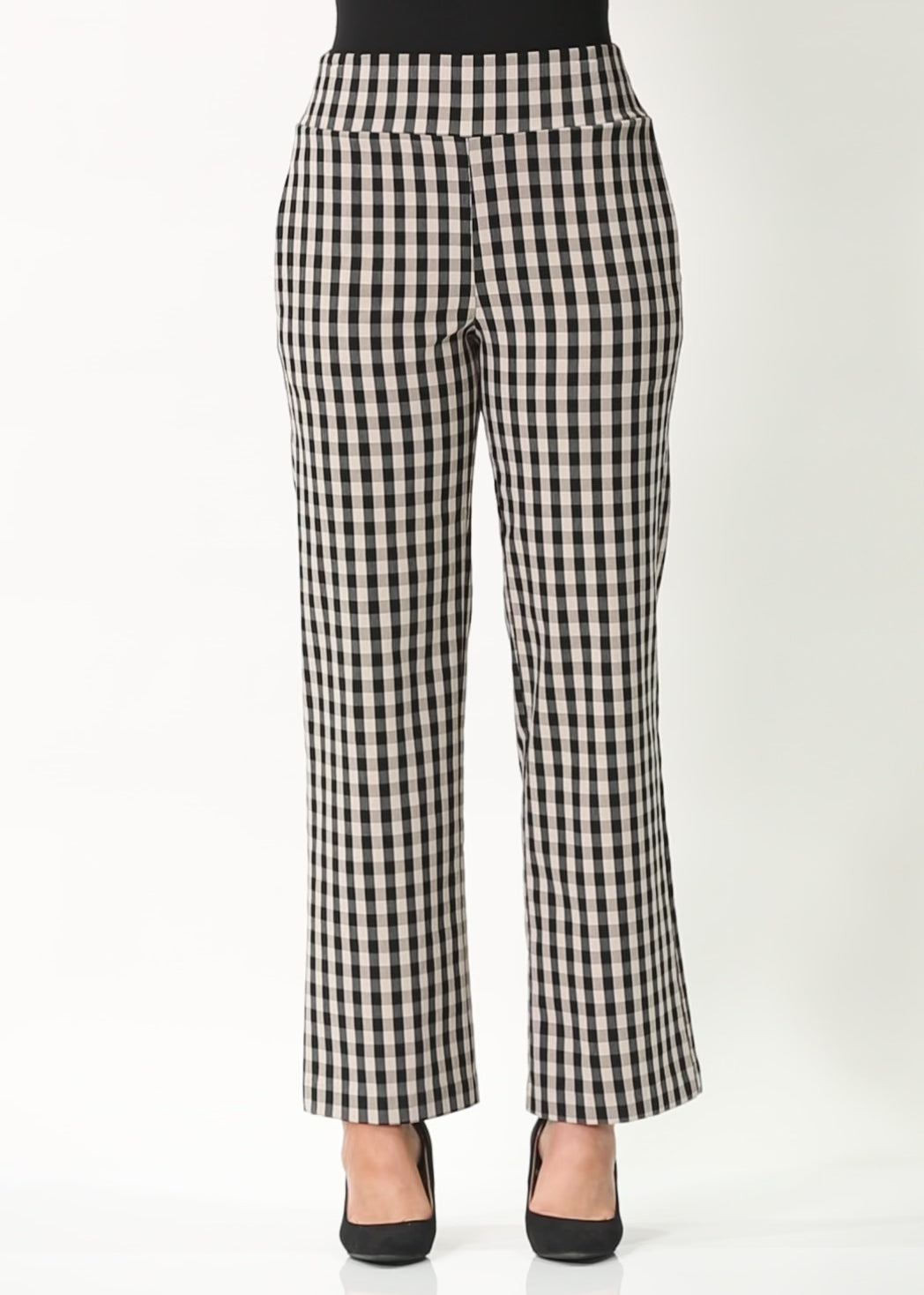 Easy wear - A classic check, in a statement silhouette of wide leg. If you love our Arrow miracle stretch Bengaline pant, then these have the same cut.