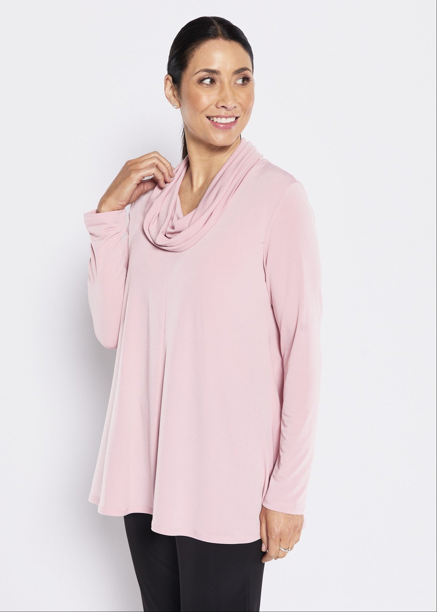 Easy wear - all day comfort in our signature smooth comfy Foundation slinky jersey. This poly knit fabric is perfect for our busy lives and travel alike due to its crease resistance, longevity and durability. Carmen cowl tunic is a lovely throw on and go piece, designed to flatter with coverage.