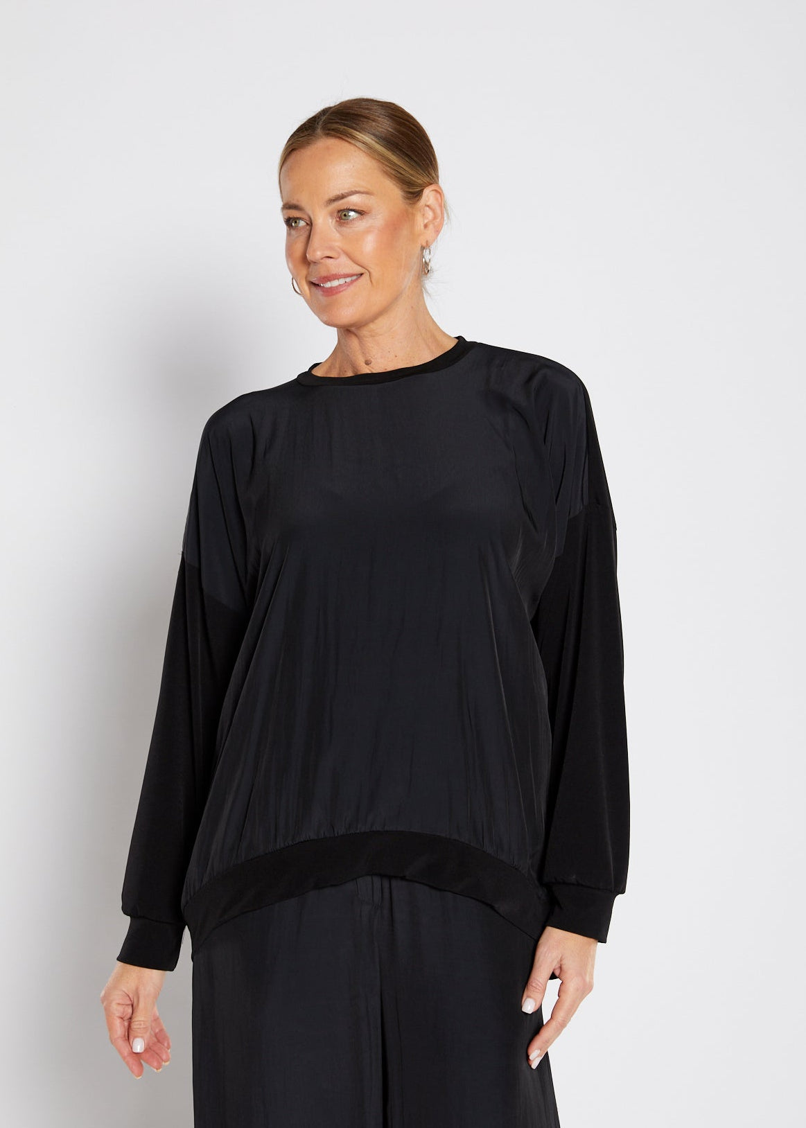 Easy wear -Ā classic crew neck relaxed long sleeve top with a spliced Lustre technical to the front, Foundation slinky jersey to the back.
