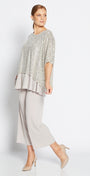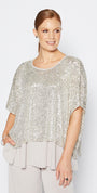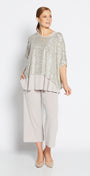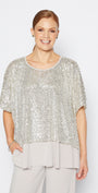 Wear anywhere - a great piece to add some sparkle to your day, and to glam up for evening. This tabard style top is unlined and must be worn over an under layer. We have styled Kay with Sun Foundation slinky jersey reversible swing tank in champagne, and we recommend purchasing both styles. Team with Bengaline pants or your favourite jeans. Pop over your office outfit to take you from desk to dinner. A great evening cover up for travel as it is lightweight.