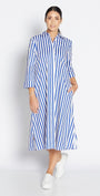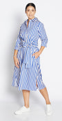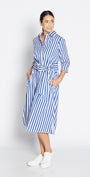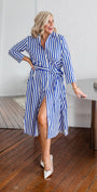 - classic shirt dress style in cobalt blue and white stripes