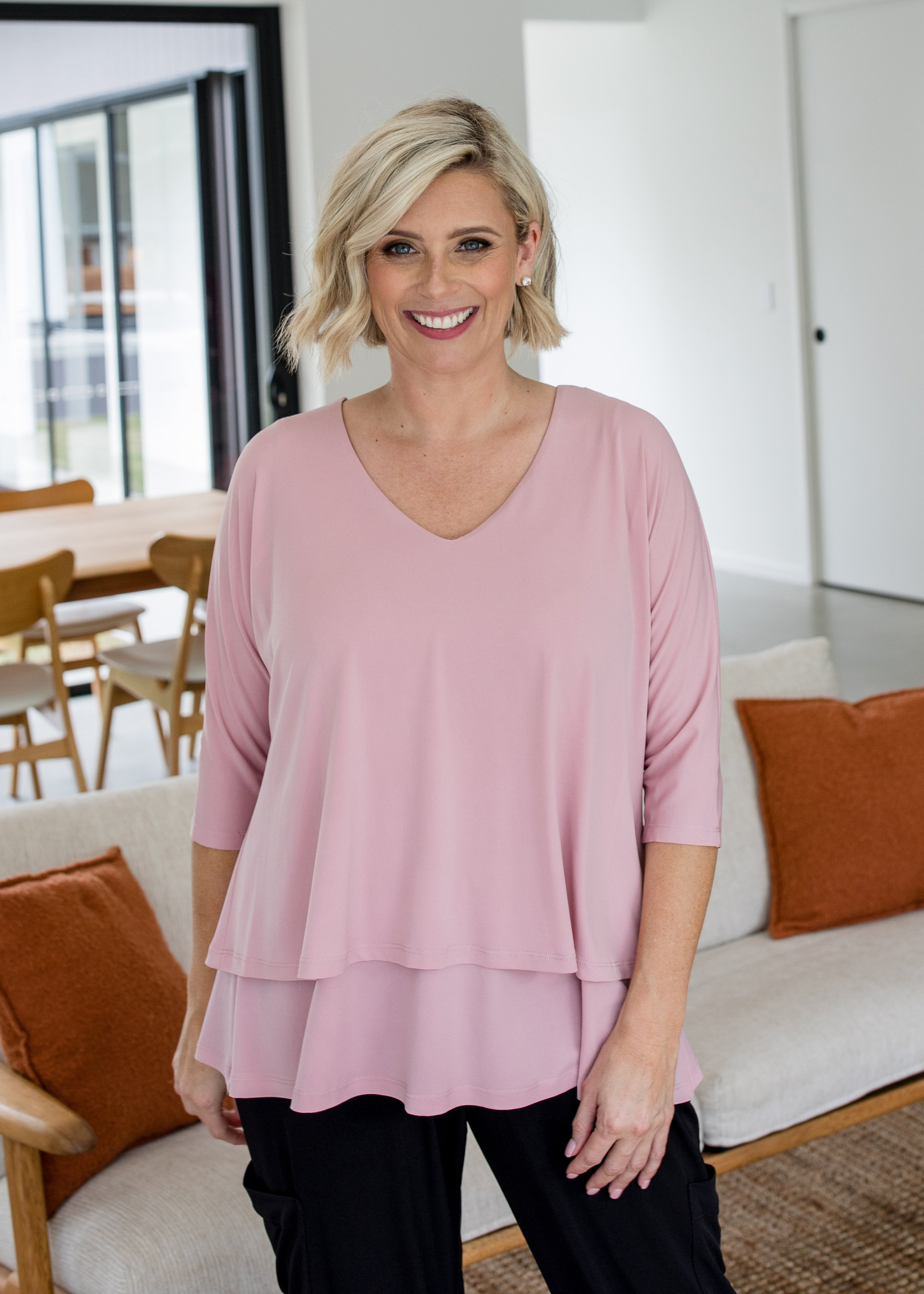 Easy wear - a relaxed but smart layered tunic, that can be worn V or crew neckline, with the bottom layer tucked or worn loose.